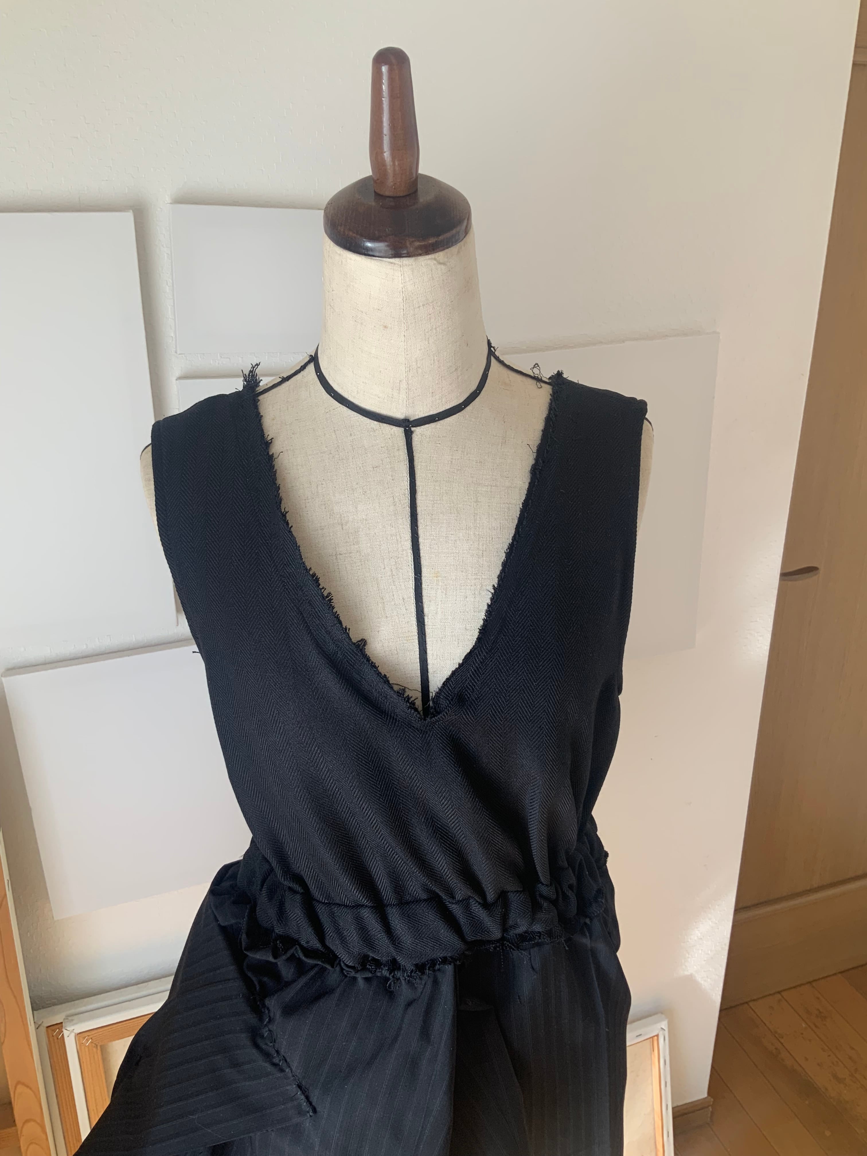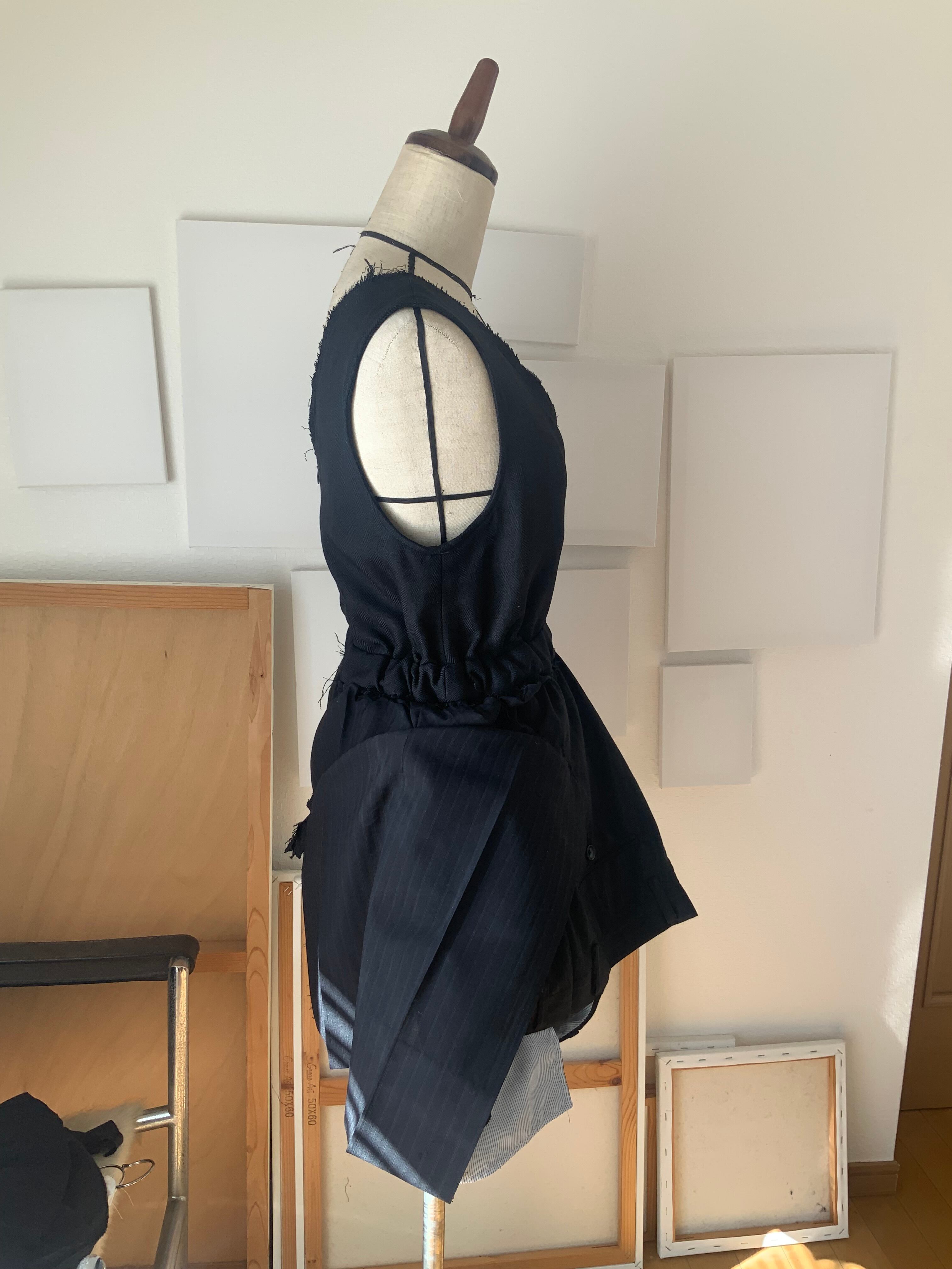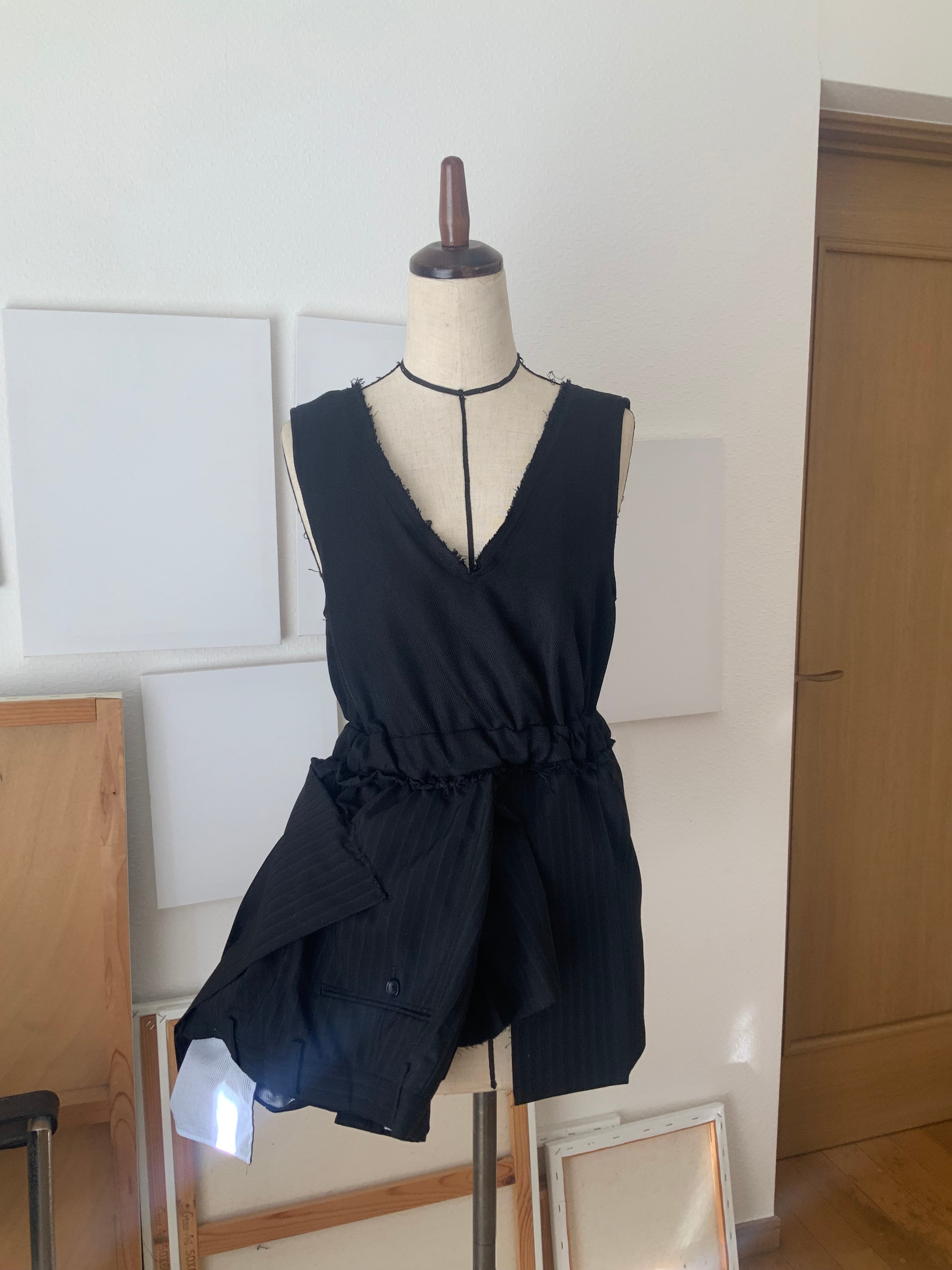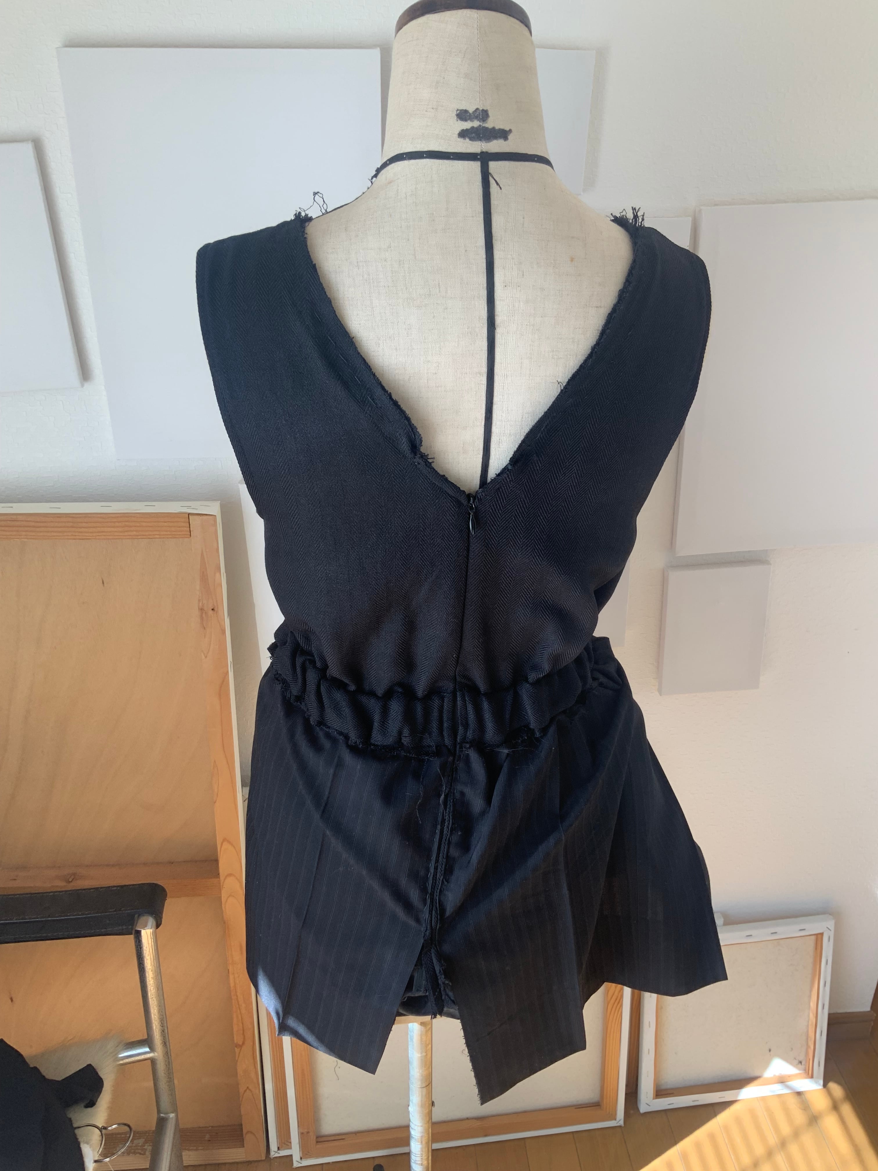 制作には、#0021のワンピースで残った裏地と、スーツパンツの布を用いています。