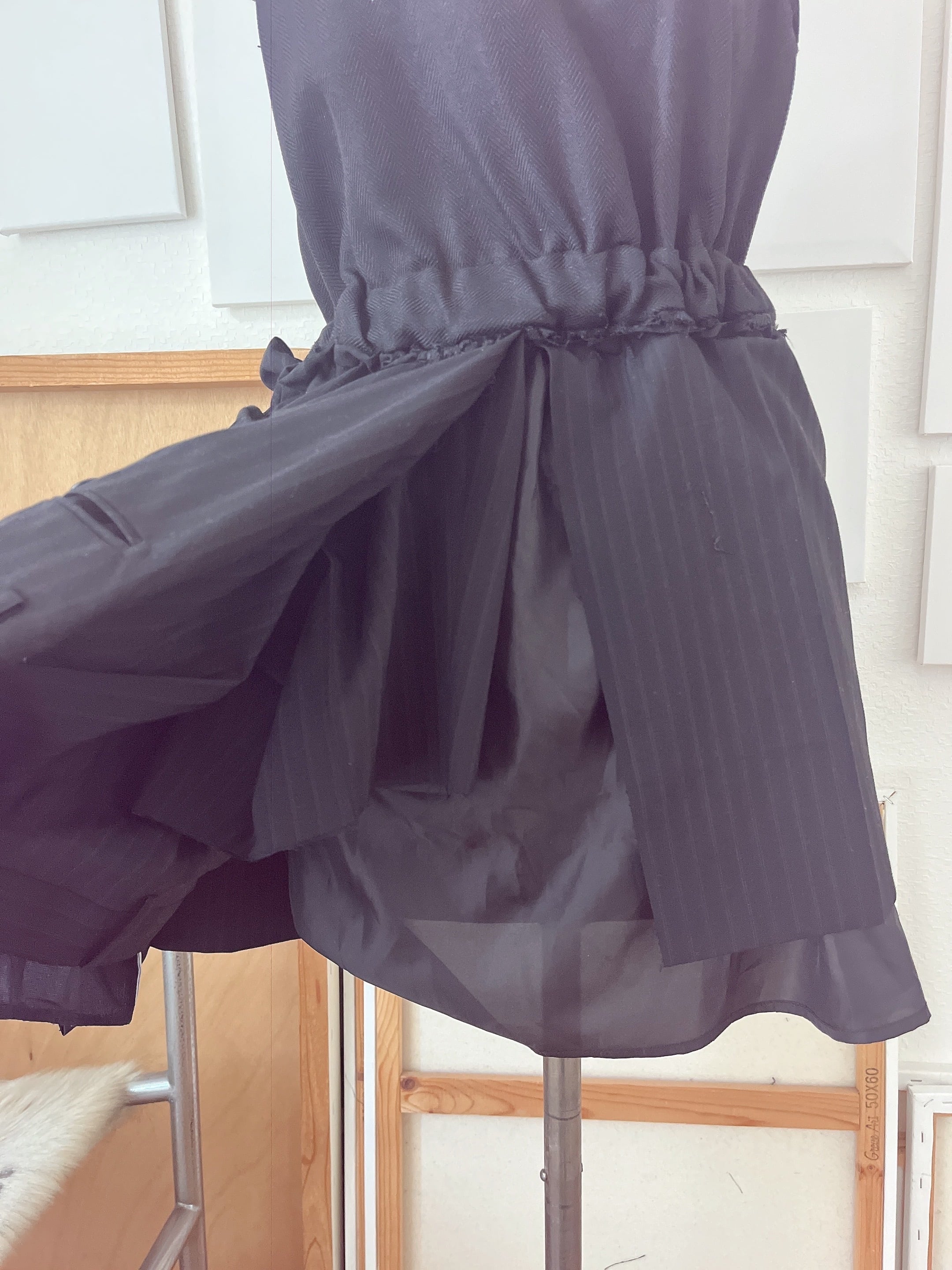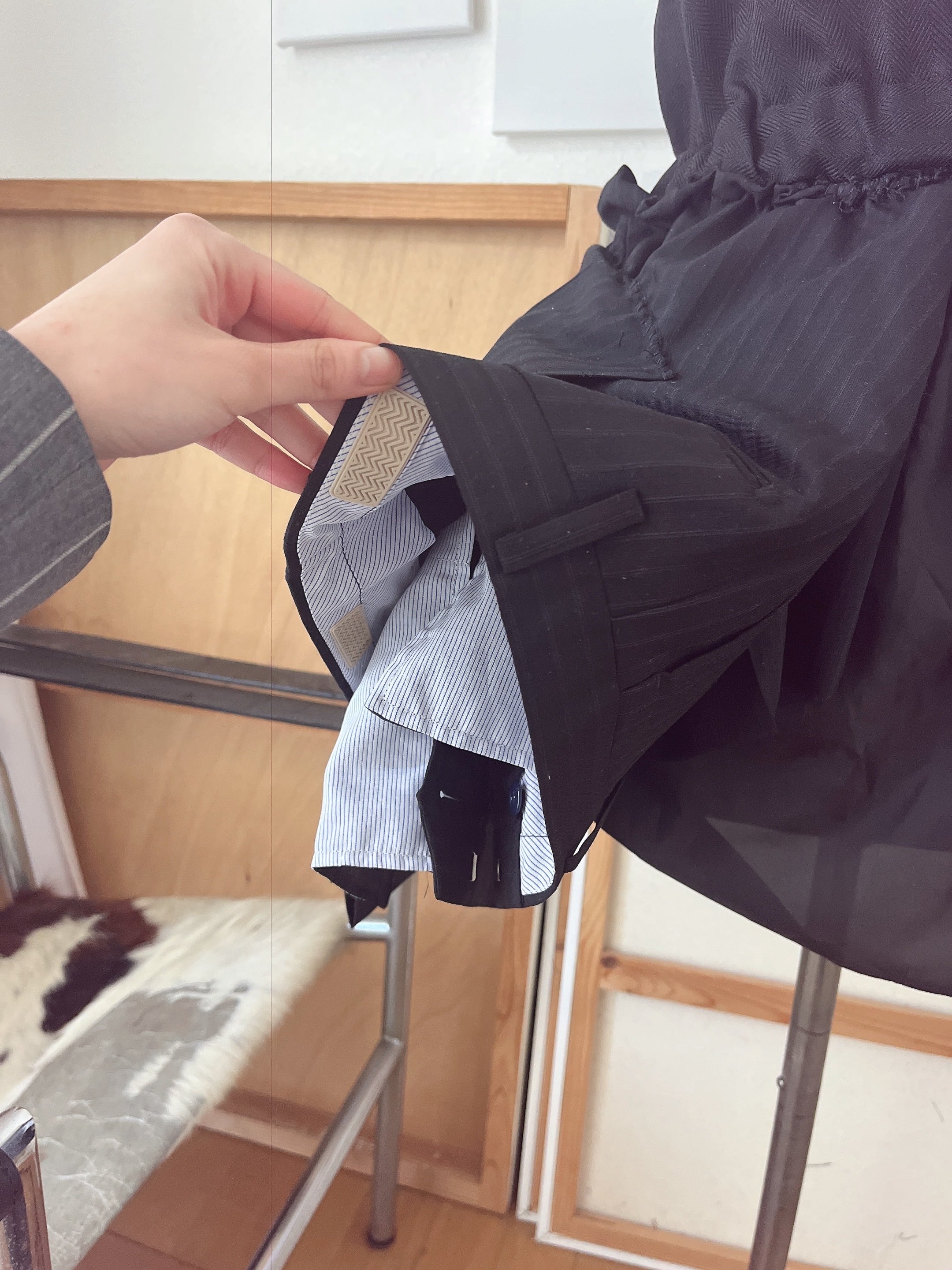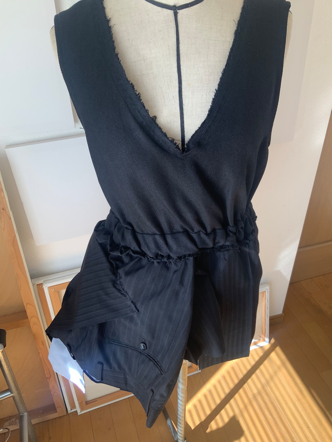 制作には、#0021のワンピースで残った裏地と、スーツパンツの布を用いています。