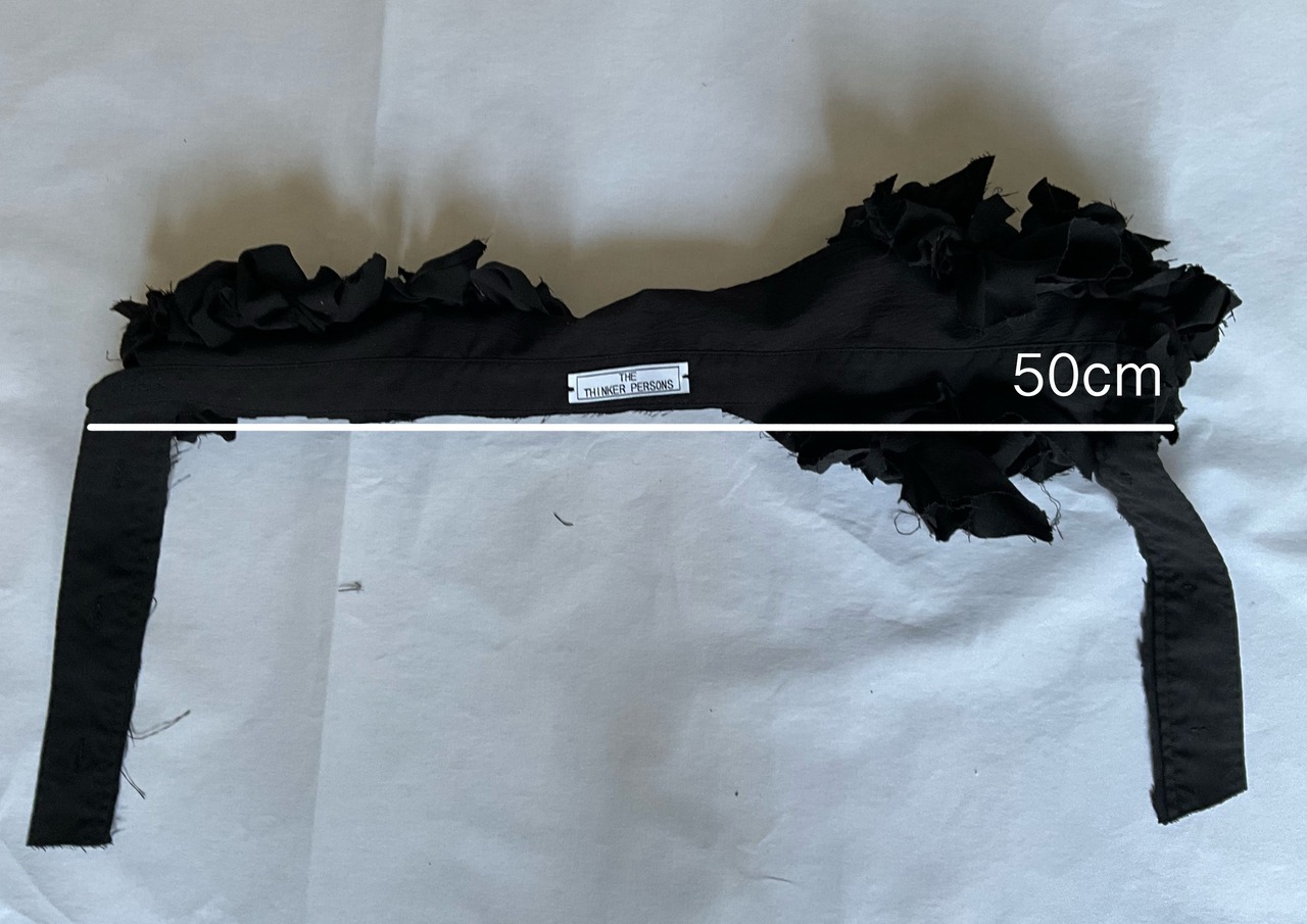 本作は、切りっぱなしのデザインをそのまま活かすため、あえてほつれ防止剤は使用していません。