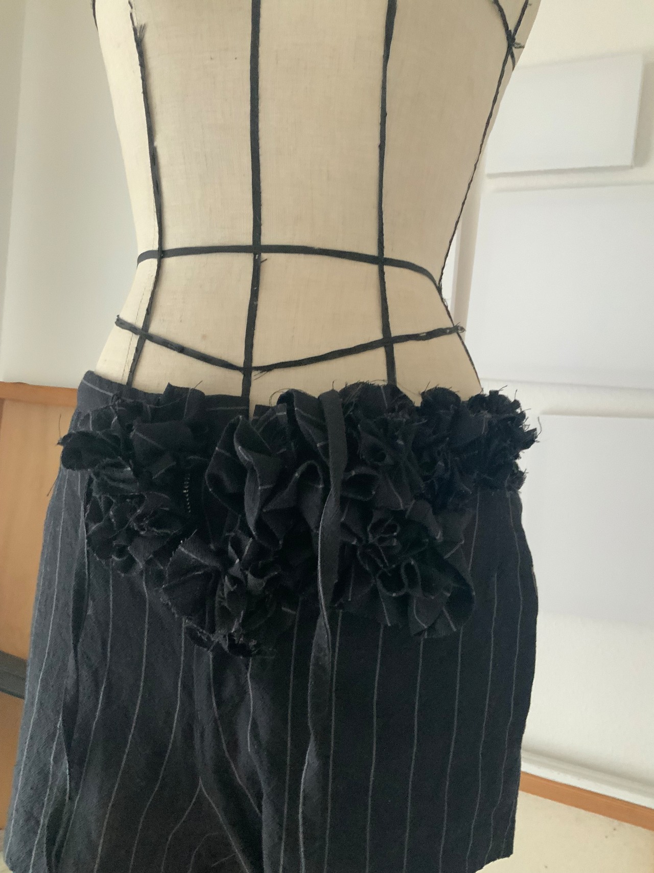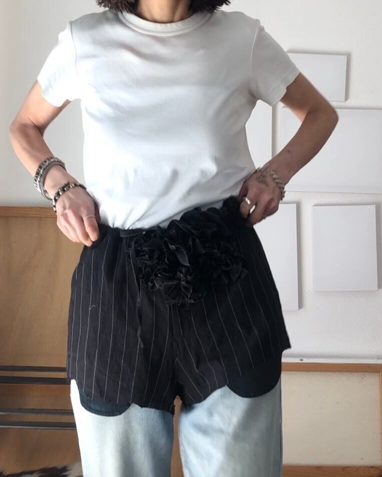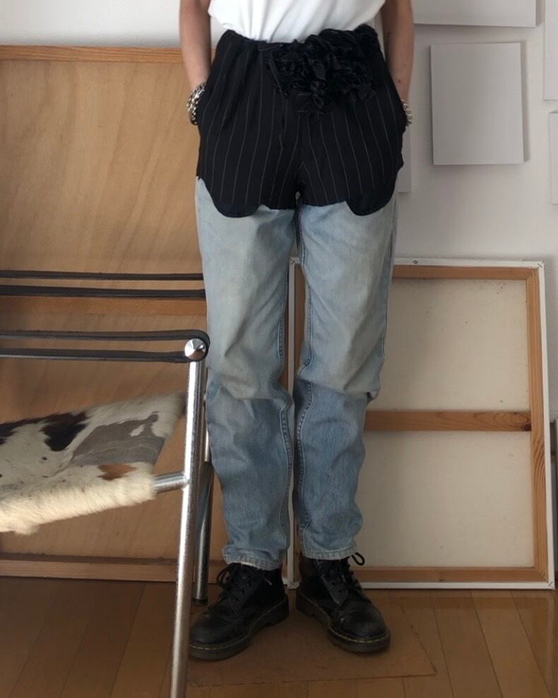 このアイテムには、あえて「整えなかった跡」を残しています。切り取った布の輪郭や切りっぱなしの部分は、デザインとしてそのまま活かしています。そのため、ほつれやラフな表情が見られる場合や、着用・洗濯によって風合いが変化していきます。